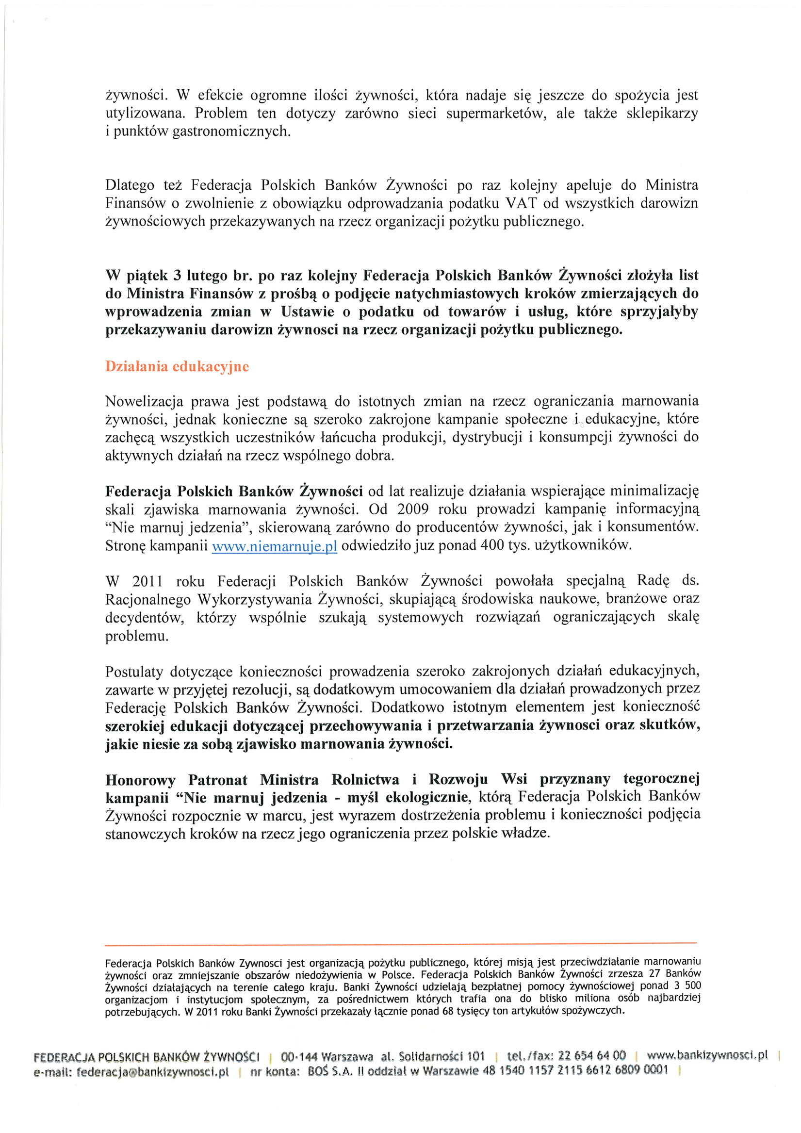Zarówno minister Marek Sawicki jak i prezes Marek Borowski zgodnie podkreślili, że do osiągnięcia stanu idealnego w zakresie wykorzystywania wyprodukowanej żywności mogłaby przyczynić się zmiana prawna w zakresie przekazywania żywności na cele charytatywne przez dystrybutorów, bez ponoszenia dodatkowych kosztów, bez dodatkowego opodatkowania, tak jak ma to miejsce w przypadku producentów. – Byłby to kolejny krok w drodze do rozwiązania zrównano problemu marnotrawienia żywności, jak i zmniejszenia liczby osób niedożywionych. Osiągnięcie stanu idealnego w zakresie niemarnowania żywności w Europie dałoby około 4 kg żywności dziennie na jedną osobę niedożywioną. Gdybyśmy w chociaż 50. procentach ograniczyli marnotrawienie żywności w Europie, problem niedożywionych zostałby rozwiązany – powiedział szef resortu rolnictwa.
