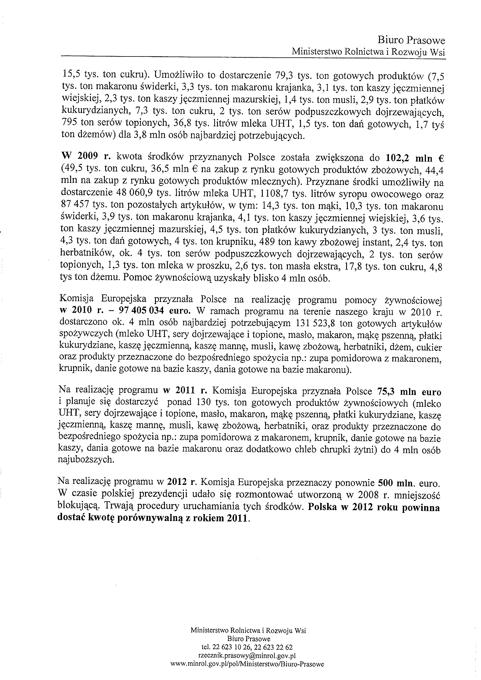 Impulsem do dzisiejszego spotkania było ogłoszenie na forum Parlamentu Europejskiego rezolucji „Jak uniknąć marnotrawienia żywności: strategia na rzecz poprawy łańcucha żywnościowego w UE”. Minister zwracając uwagę na problem podkreślił, że zdecydowanie za dużo żywności wyrzuca się do kosza. W krajach Unii Europejskiej jest to 89 mln ton, a w Polsce 9 mln ton. – To nonszalanckie, nieświadome postępowanie, to brak szacunku dla trudu rolnika, który jest producentem żywności. Trzeba zwrócić uwagę na ten problem również w kontekście rosnących potrzeb żywnościowych, za którymi coraz trudniej będzie nadążyć. Również ten aspekt zmusza nas, jako konsumentów, do racjonalnych zachowań – powiedział Marek Sawicki.