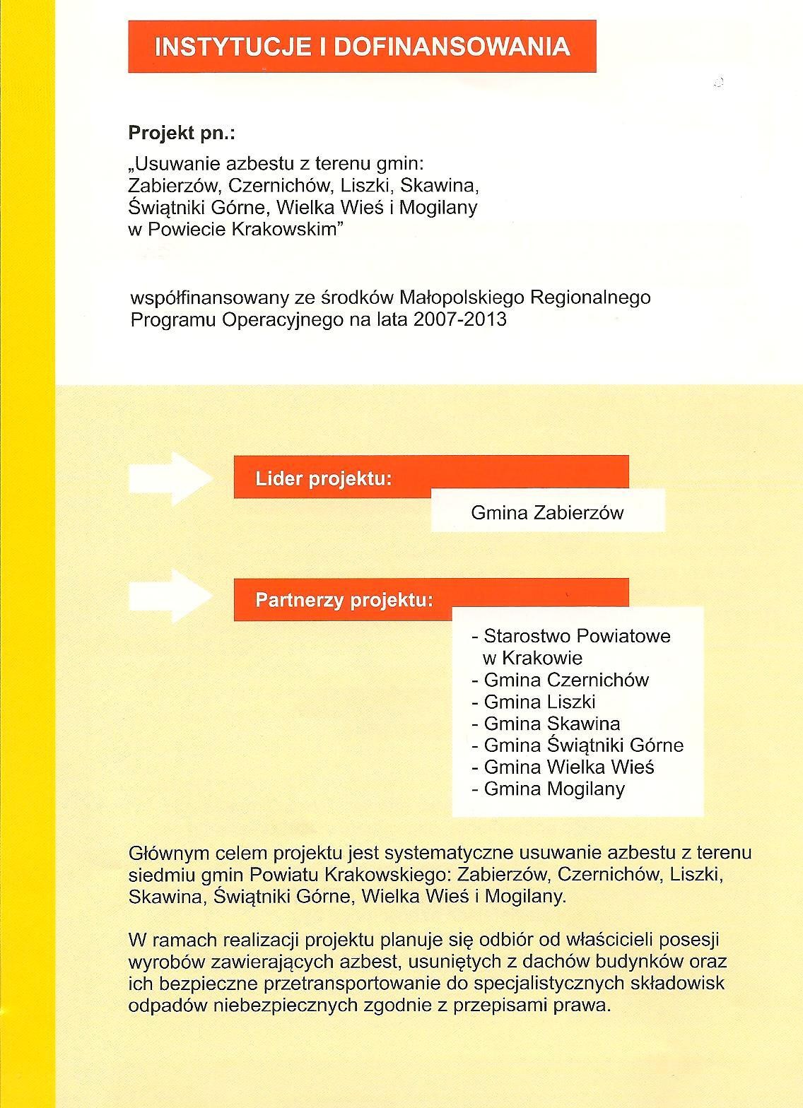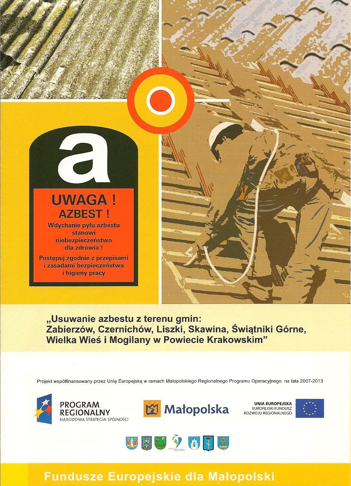 Zgodnie z realizacją projektu pn.” Usuwanie azbestu z terenu gmin: Zabierzów, Czernichów, Liszki, Skawina, Świątniki Górne, Wielka Wieś i Mogilany w powiecie Krakowskim’ w ramach Działania 7.3 Małopolskiego Regionalnego Programu Operacyjnego.