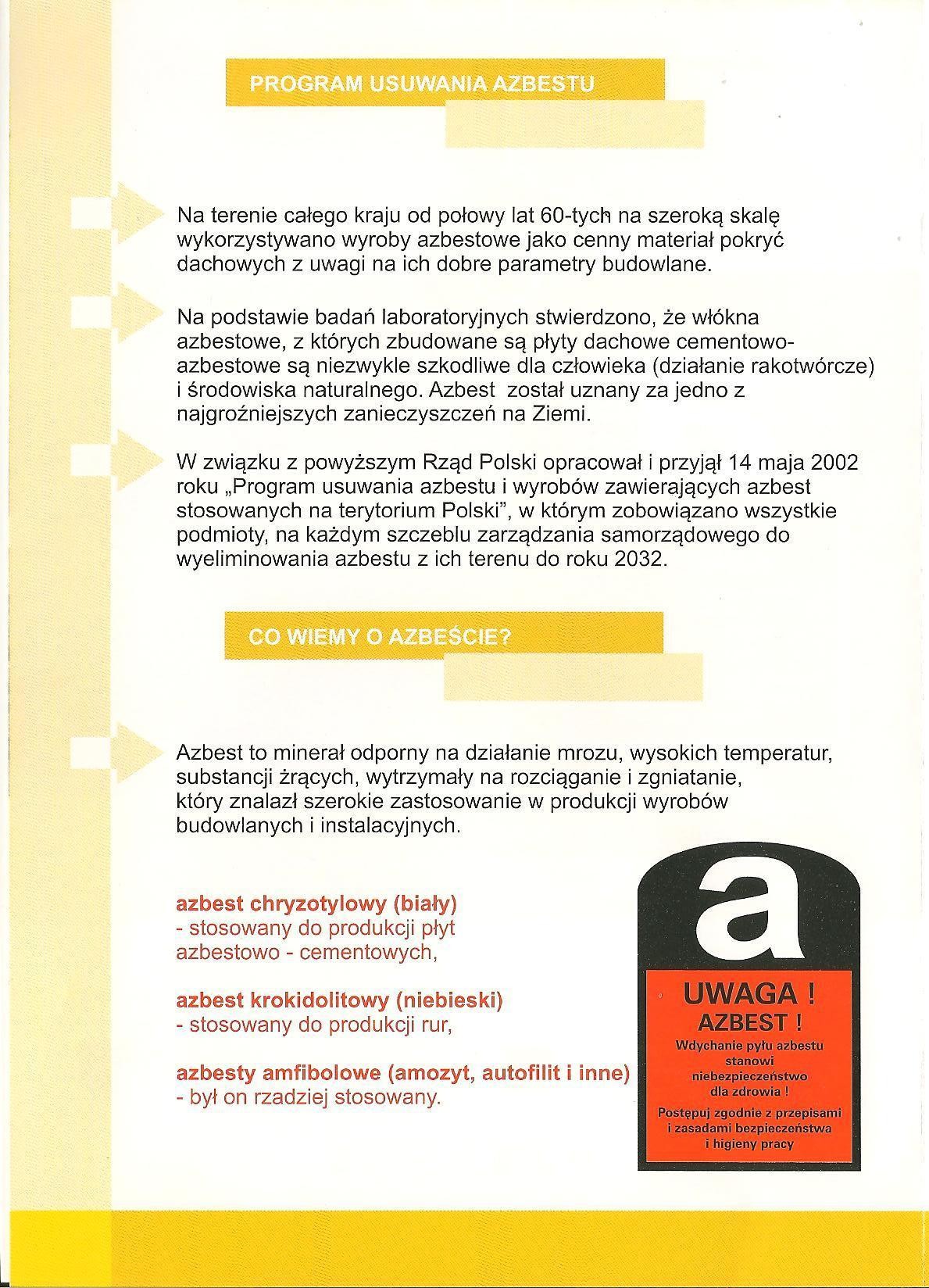 INFORMUJE że WYWÓZ AZBESTU ROZPOCZNIE SIĘ od dnia 01 LIPCA 2010 r. do 30 PAŹDZIERNIKA 2010 r. oraz od dnia 01 KWIETNIA 2011 r. do dnia 30 LIPCA 2011 r.